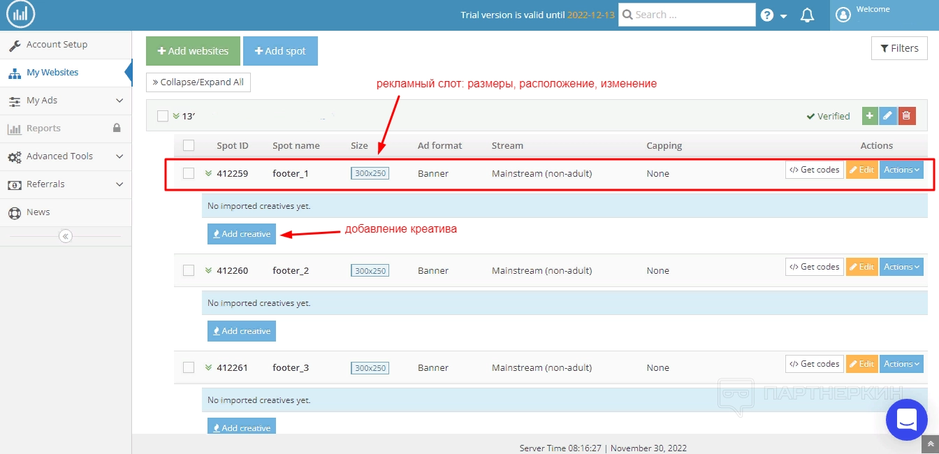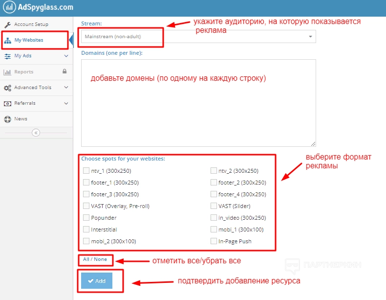 После подключения рекламной сети требуется создать кампанию и добавить креативы. Это делается в разделе My Websites.
