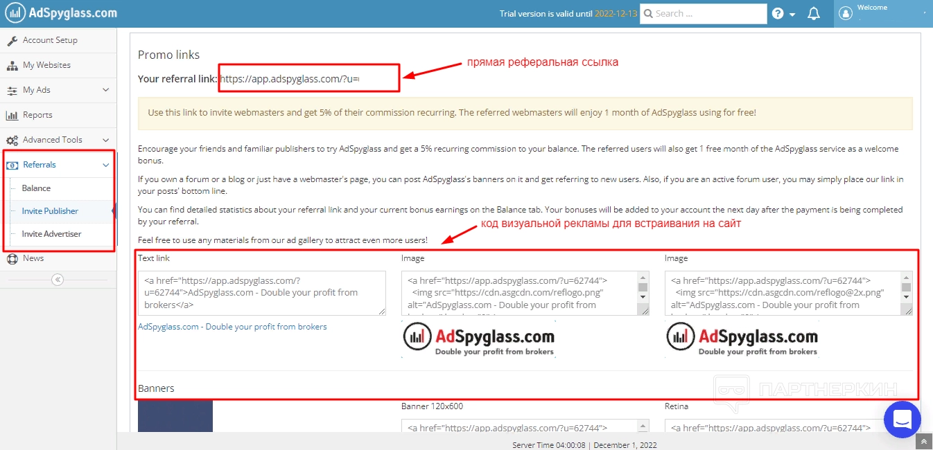 Чтобы пригласить веб-мастера, откройте Invite Publishers. Можно воспользоваться прямой партнерской ссылкой или скопировать HTML-коды визуальной рекламы, которые встраиваются на сайт. Приглашенный участник получит 1 месяц бесплатного использования