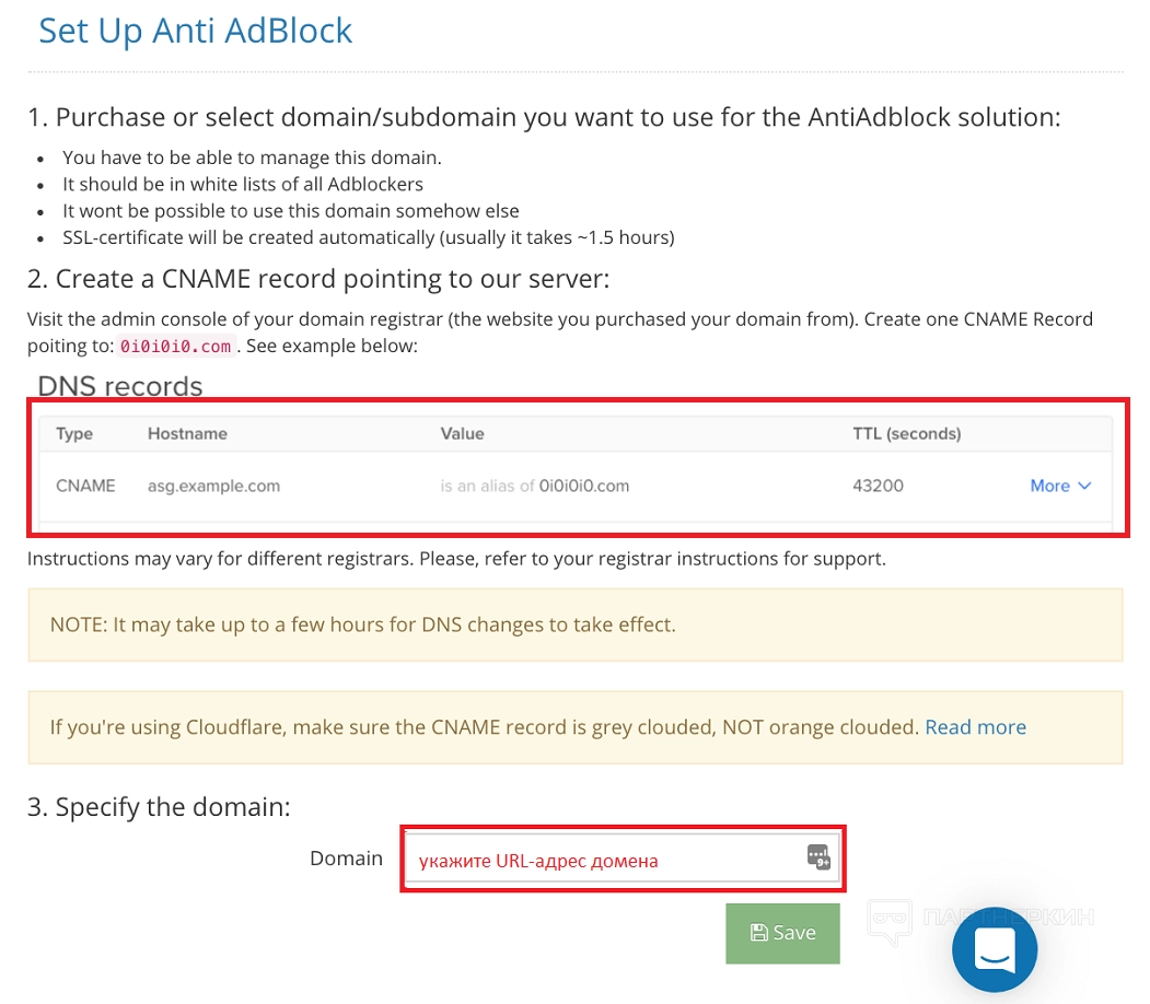 Чтобы воспользоваться функцией, требуется приобрести новый домен и присвоить ему выданную запись CNAME. После этого подключите его в разделе Anti AdBlock. Обратите внимание, что добавленный адрес нельзя использовать для каких-либо иных целей.
