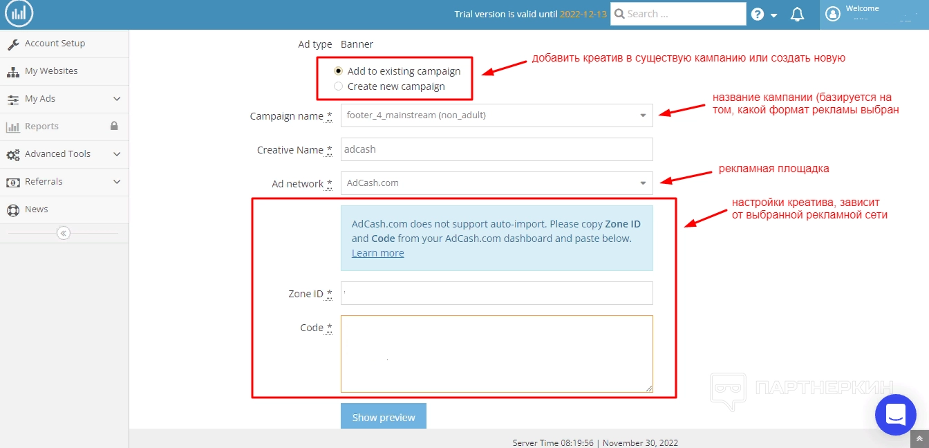 Основное направление сервиса – адалт-тематика, но по сути можно подключать сайты с любой темой. Нужно лишь выставить нужные настройки при создании рекламного слота. И на этом шаге отметим первый недостаток: запутанное разделение рекламных кампаний на саму кампанию, креативы и слоты. Даже если вы хорошо понимаете английский язык, разобраться в этих нюансах может быть сложно.
