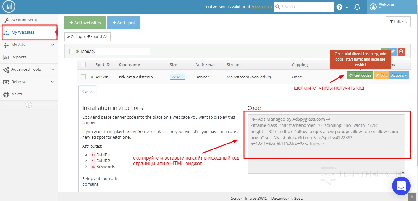 Финальный шаг – добавление рекламного блока на сайт. Для этого вернитесь в раздел My Websites и щелкните Get codes. Если все настроено правильно, сервис отобразит код, который нужно скопировать и встроить в ту часть веб-страницы, на которой будет показываться реклама.