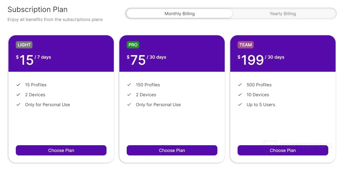 - Light . Стоимость — $15 / 7 дней. Можно создавать 15 профилей, количество пользователей — 1 человек, количество устройств — 2. Эта подписка позволит протестировать функции в течение недели по выгодной цене.