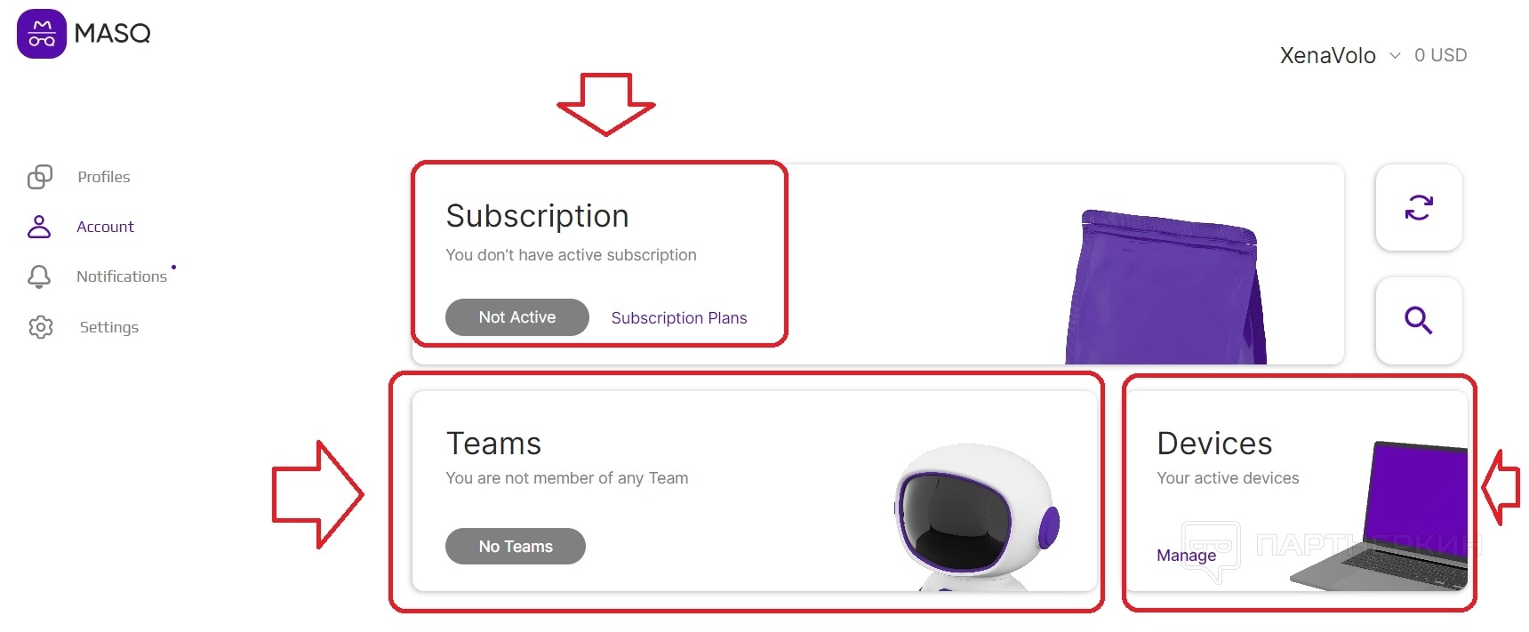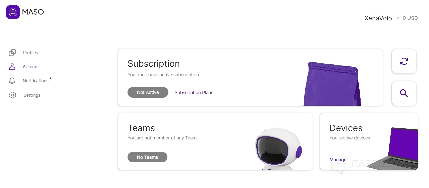 - Аккаунт . В этой вкладке можно добавлять участников команды, устройства, выбирать тарифный план. Подключение членов команды доступно после выбора и оплаты соответствующего тарифа.