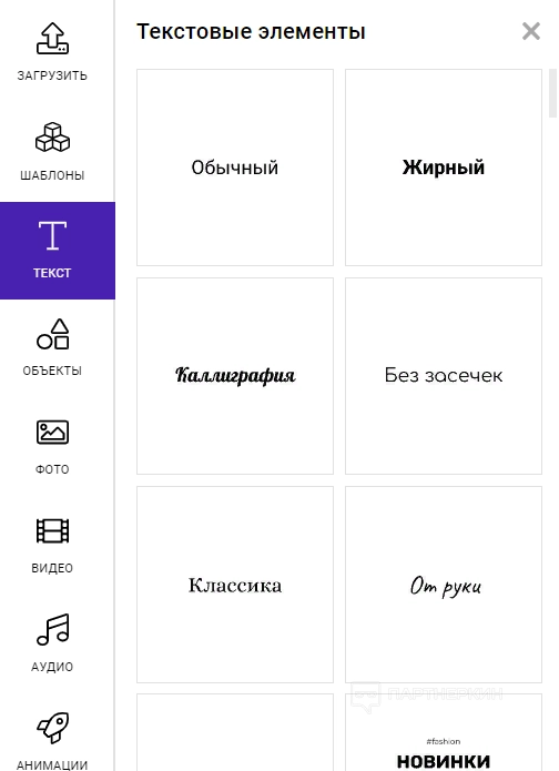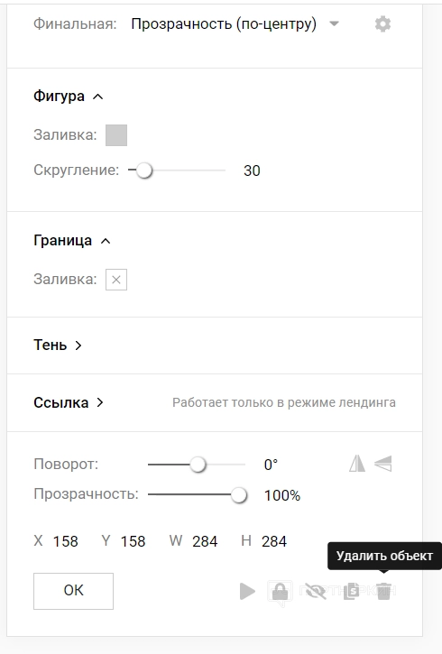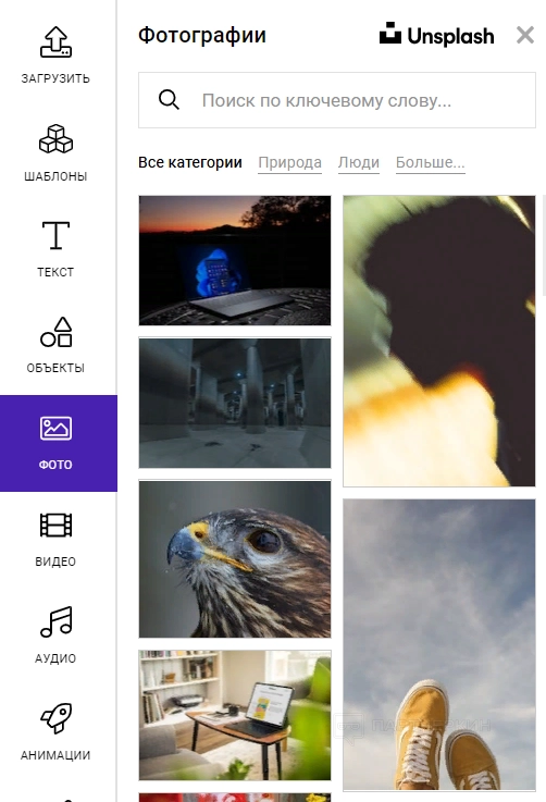 Иконка с «Фотографией» отвечает за добавление изображений внутри проекта. Поддерживаются форматы jpg, png, svg.