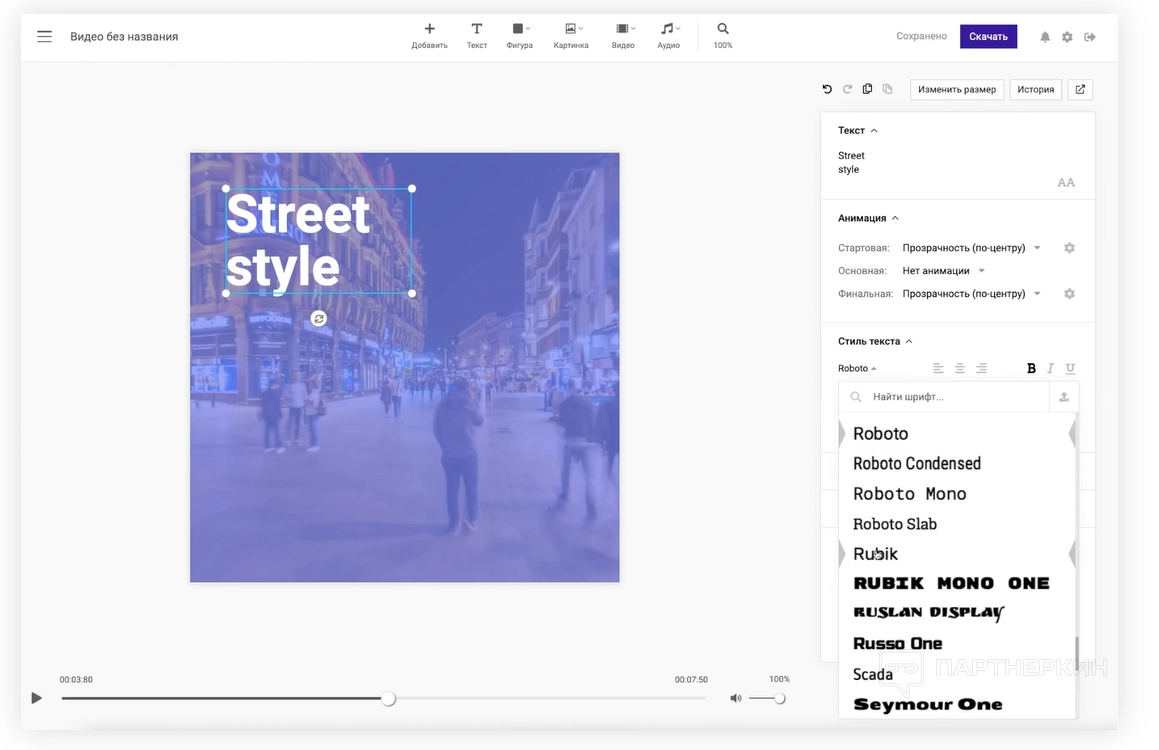 Из интересного — можно изменять размер, стиль и цвет шрифта. Также программа позволяет добавлять тень буквам и анимировать их. Выбор состоит из «стартовой», «основной» и «финальной» в соответствии с временными границами.