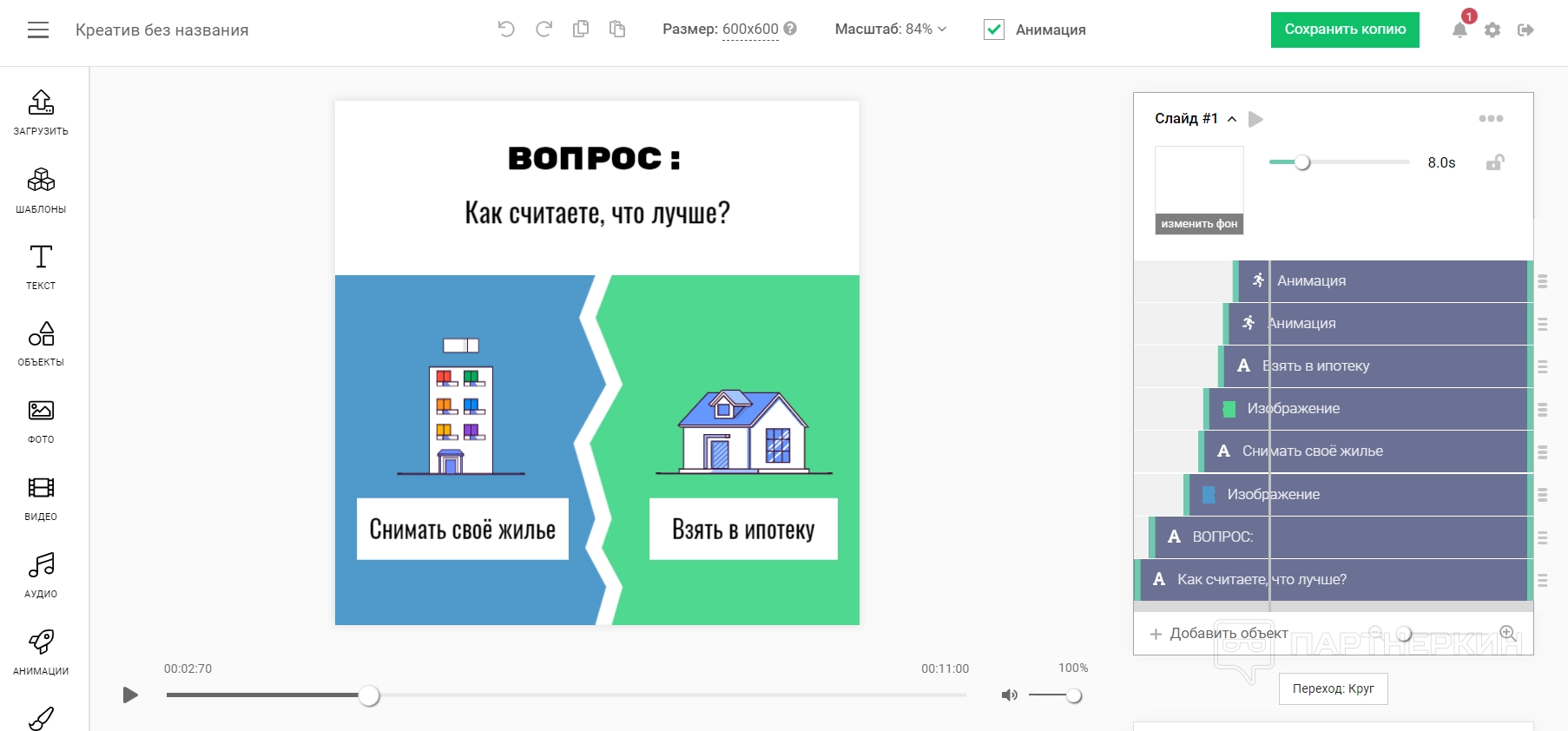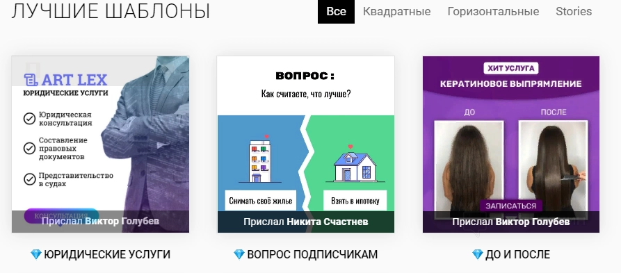 Бесплатный тариф — отличная возможность привыкнуть к наиболее простому инструментарию видеоредактора, «поигравшись» с настройками и возможностями рекламных сторис. Помимо этого, есть несколько приятно сложенных шаблонов, которые дадут понять, как правильно и красиво можно расставлять фигуры на слайде.