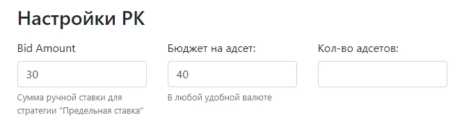 - Бюджет на адсет. Значение указывается в удобной валюте.