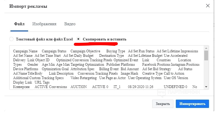 - Вставить информацию для импорта в поле «Скопировать и вставить».