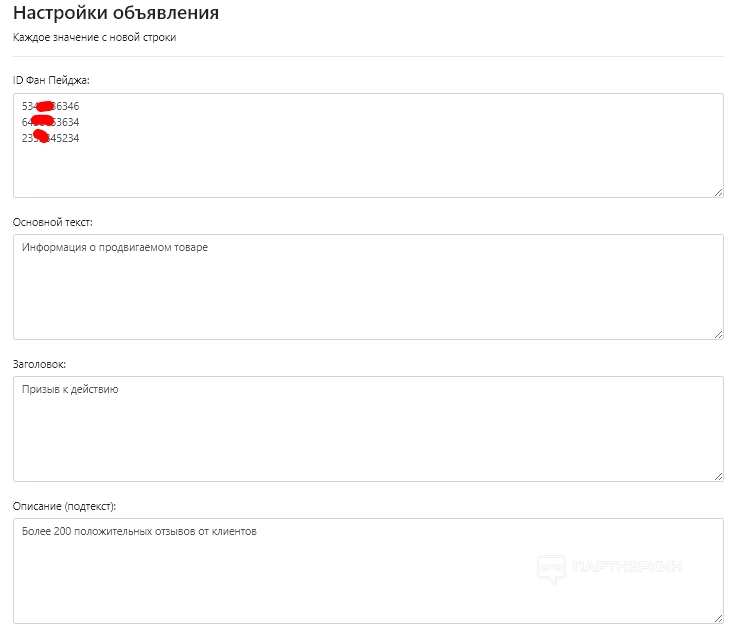 В настройках объявления для каждого аккаунта нужно указать ID фан пейджа. При желании можно прописать основной текст, заголовок, составить описание, прикрепить ссылку и установить параметры URL.