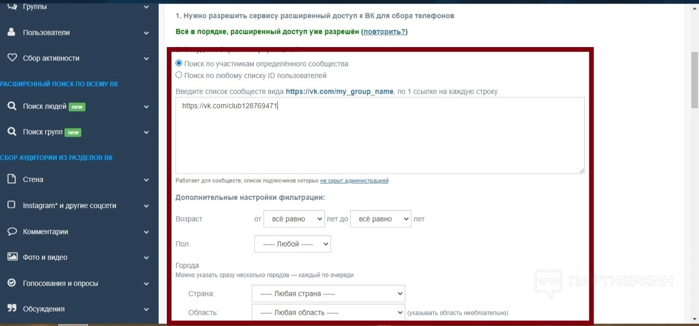 Затем начинаем заполнять необходимые пункты для того, чтобы скрипт мог качественно проанализировать аудиторию по заданным параметрам: