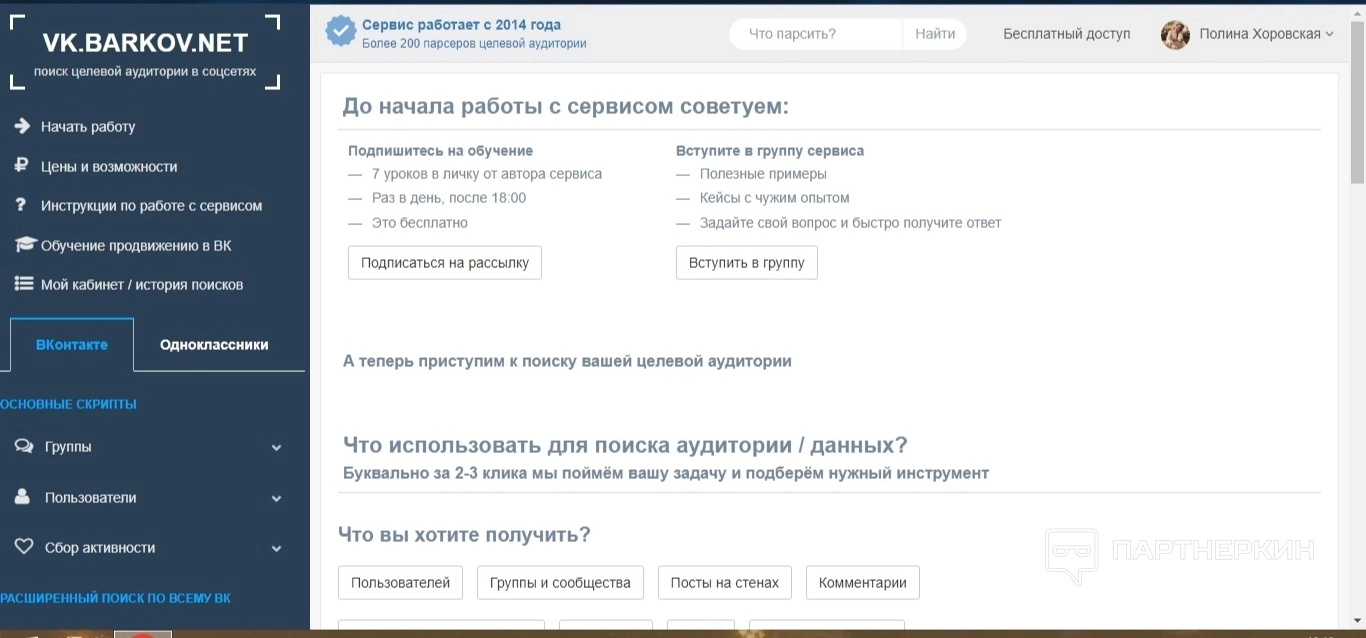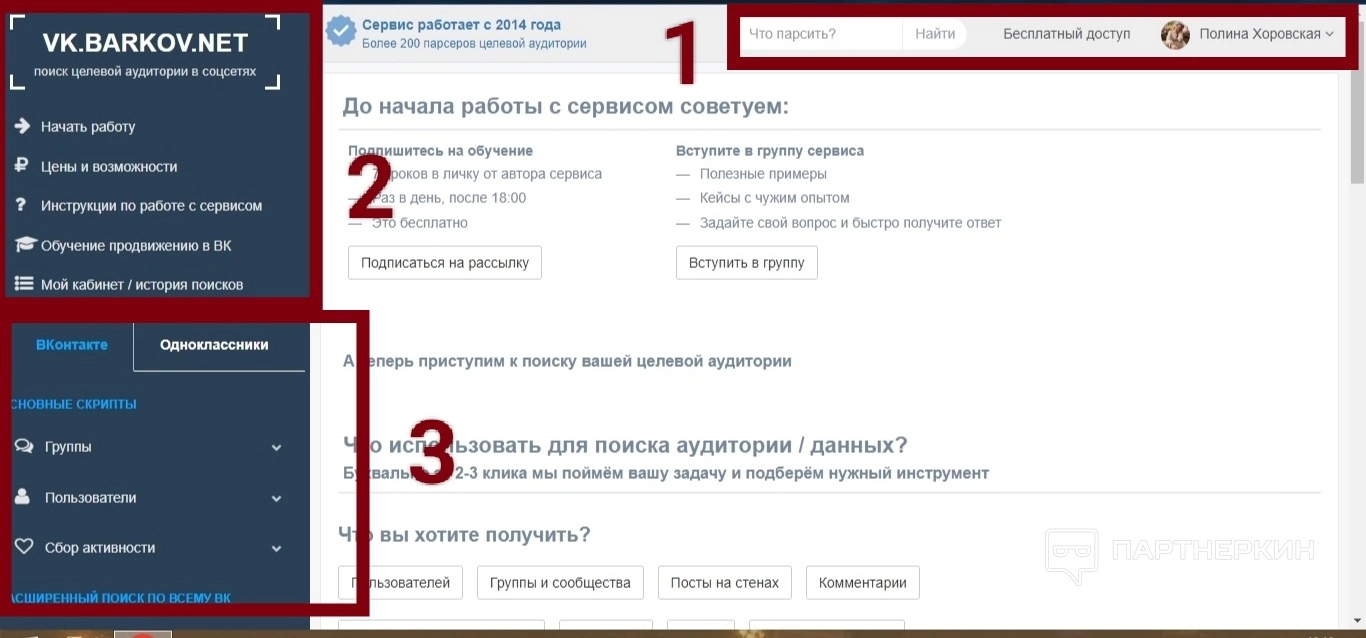 - Левое меню. В нем собраны информация о тарифах, инструкции по работе с сервисом, а также быстрая кнопка начала работы, обучение по продвижению в ВК и продублированный личный кабинет.