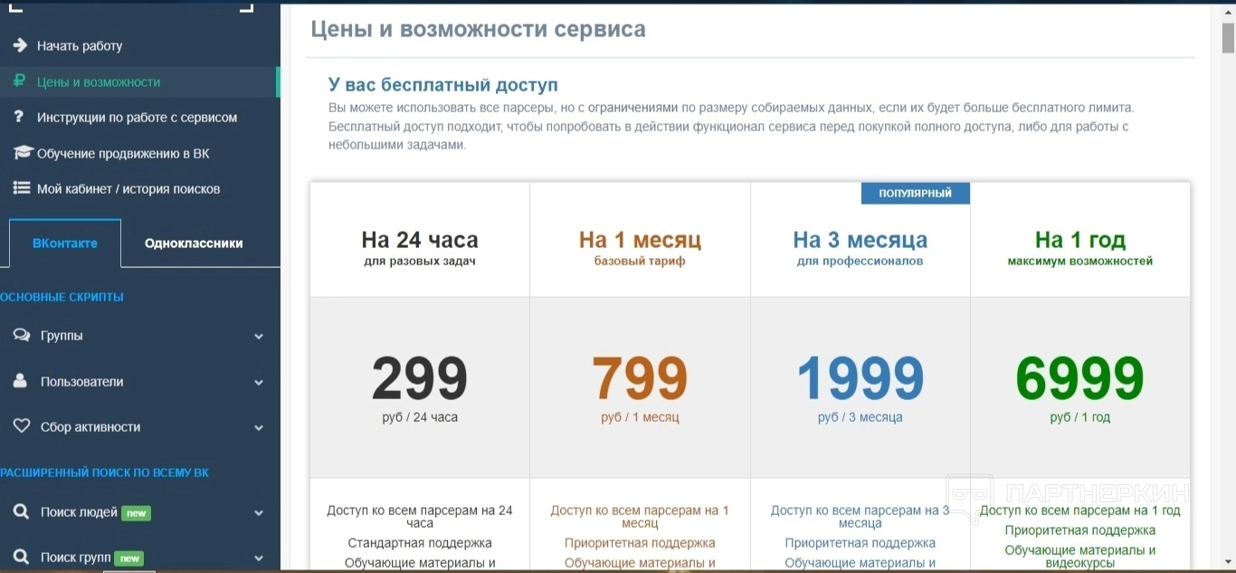 При покупке платного тарифа к использованию доступны все возможности без ограничений. Для пользователей, желающих заработать, есть партнерская программа. Для новичков также создан обучающий курс по продвижению в сети.