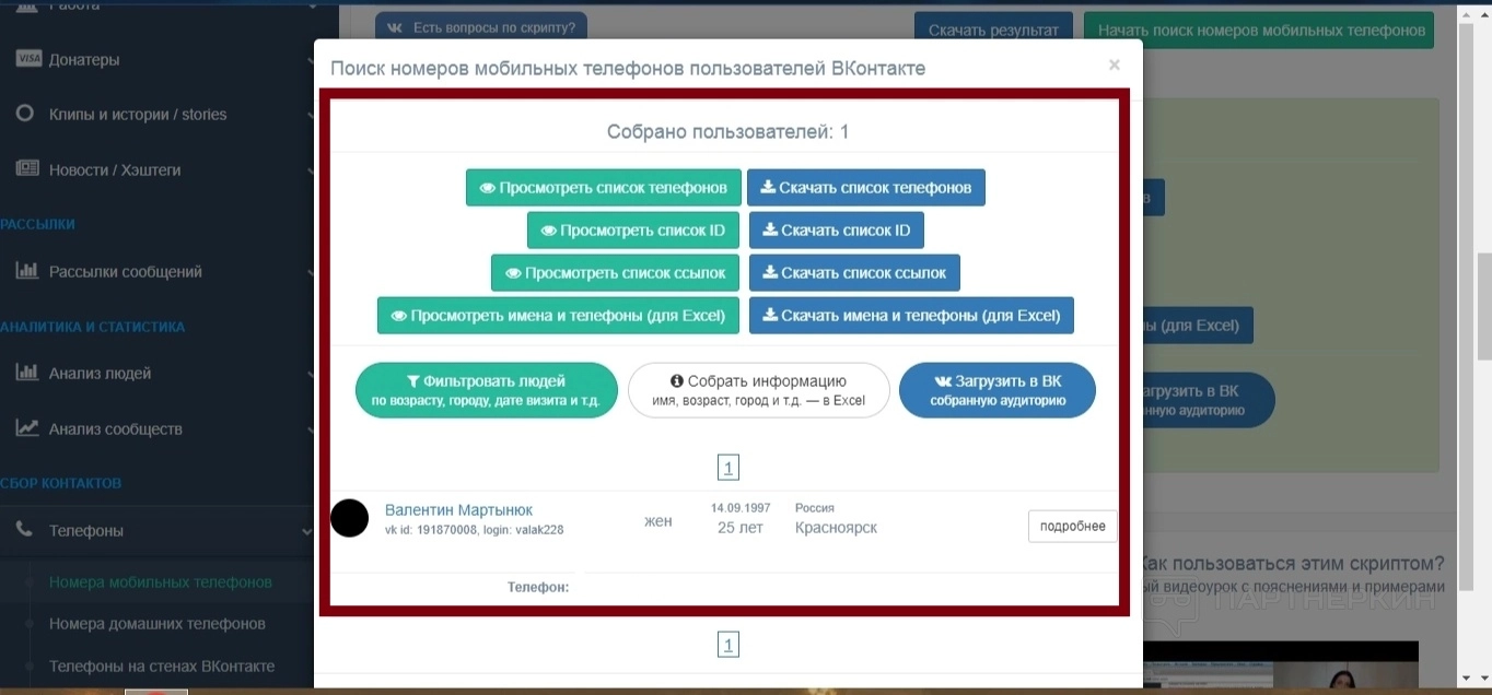Полученную информацию можно сохранять себе на устройство, скачивать только конкретные данные, а также импортировать данные в рекламный кабинет сети.