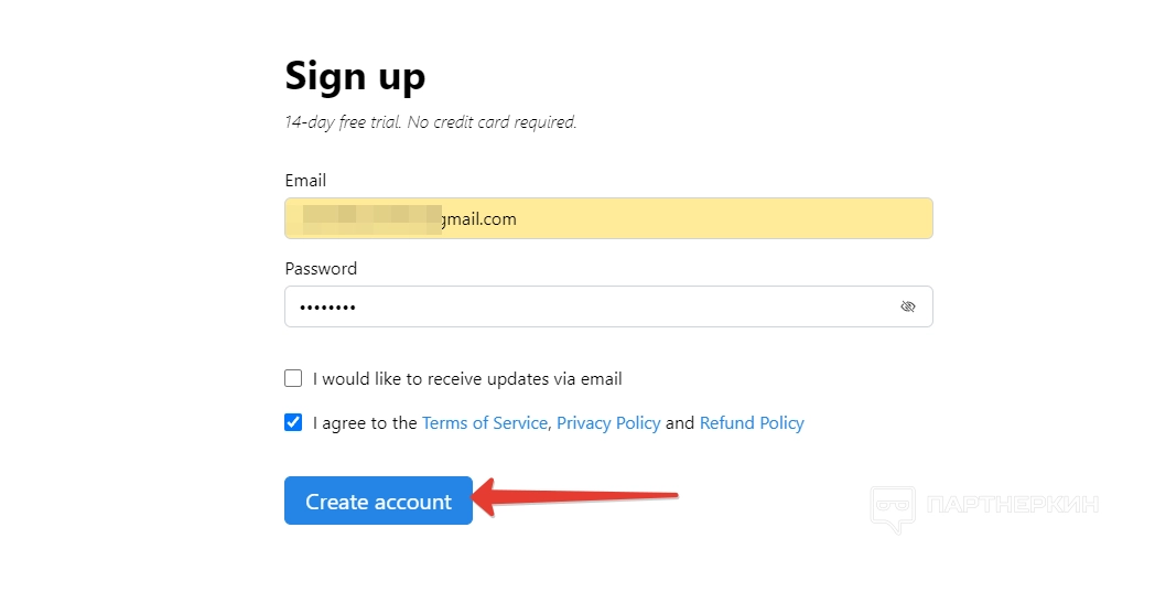 Указываем электронную почту (обязательно gmail), вводим пароль, даем согласие с условиями предоставления услуг и жмем на кнопку создания аккаунта.