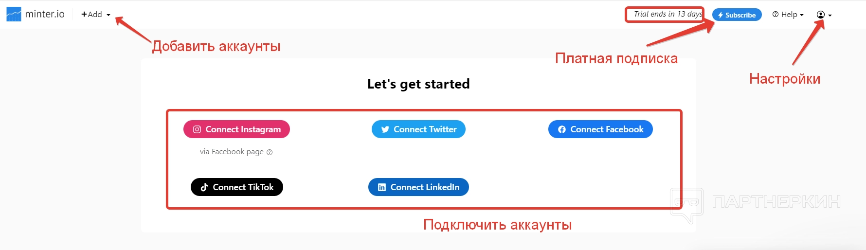 В верхней части экрана есть кнопка «Add», с помощью которой пользователь может добавлять другие аккаунты. В правом верхнем углу можно найти доступ к настройкам личного кабинета. Рядом отображается количество оставшихся дней пробного периода.
