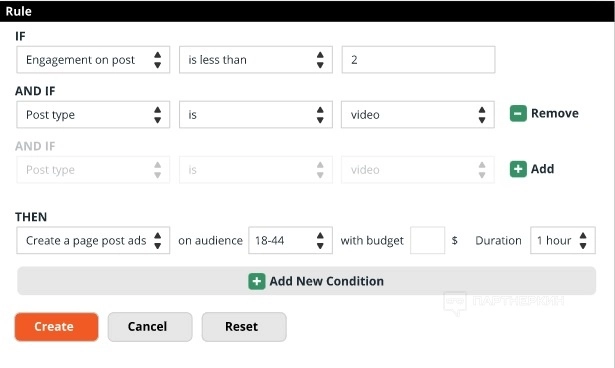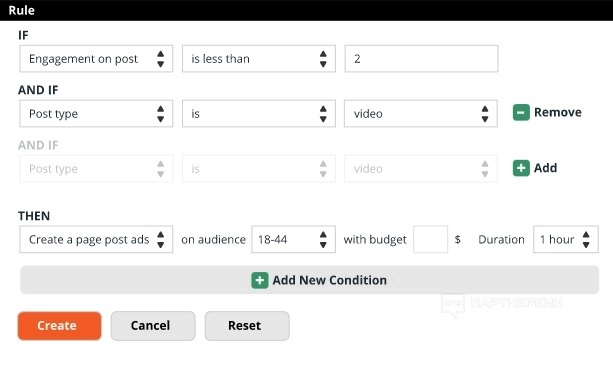 Есть также возможность автоматизировать процесс с помощью гибких правил. Эти правила могут применяться к объявлениям, группам объявлений и кампаниям. Они могут использовать метрики Facebook*, сторонние метрики или пользовательские расчеты для KPI, например, звонки + события + заполнение форм FB*.