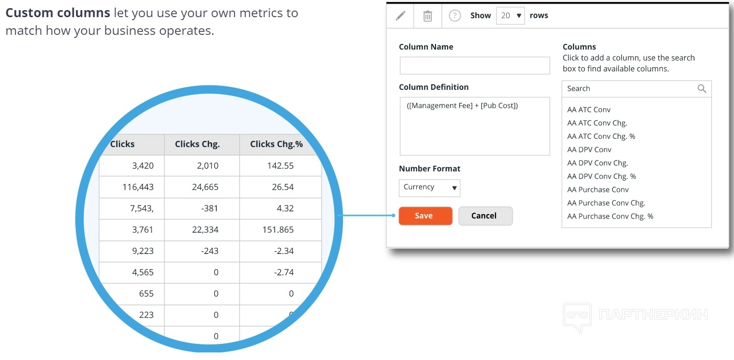 - MarinOne Dimensions — сводные таблицы с данными на нескольких уровнях по учетным записям и издателям. Пользовательские столбцы позволяют использовать собственные показатели, соответствующие тому, как работает бизнес.