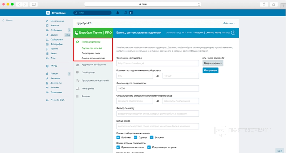 Это опция, которая позволяет настроить анализ ЦА по определенным параметрам. Чтобы активировать опцию, скопируйте ссылку ВК и вставьте ее в соответствующее поле. Дальше можно настраивать аудиторию по количеству подписчиков, групп и другим параметрам.
