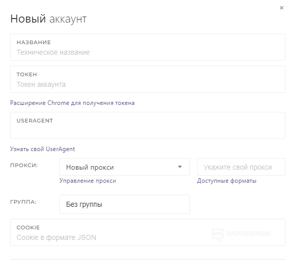 Аккаунты. В этом разделе пользователь может добавить аккаунт. Необходимо заполнить следующие поля: