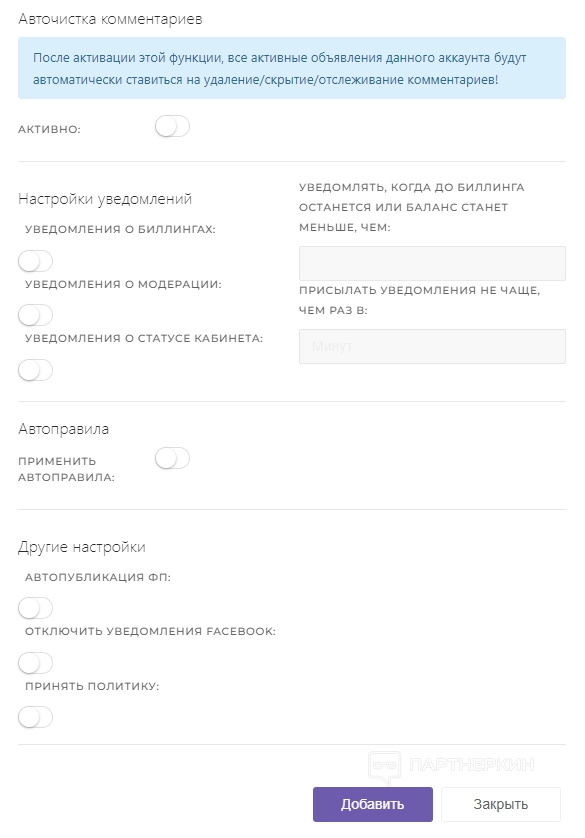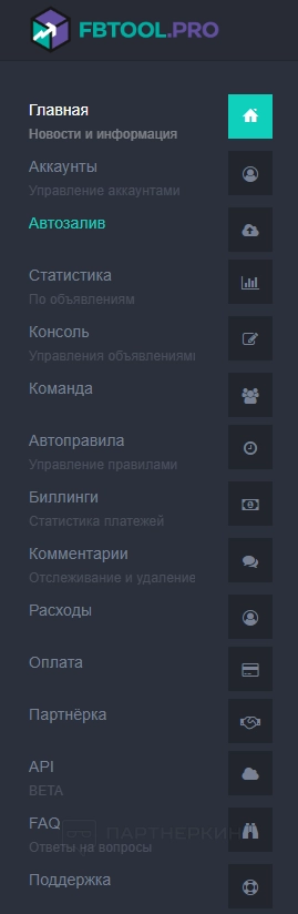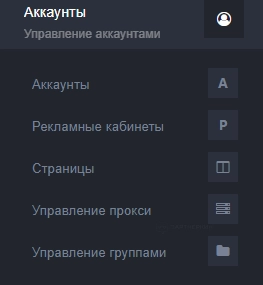 В этом разделе отображается статистика. Функция особенно полезна для пользователей, которые занимаются массовым запуском рекламы через несколько аккаунтов. Все настройки разбиты по категориям: