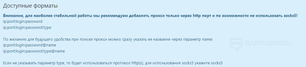 Управление прокси. Возможность добавить прокси в следующем формате: