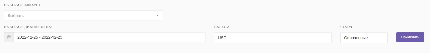 Чтобы посмотреть статистику платежей, необходимо выбрать аккаунт, настроить диапазон дат, выбрать валюту и статус (оплачено, с ошибкой или все). После применения настроек пользователю отобразится подробная сводка.