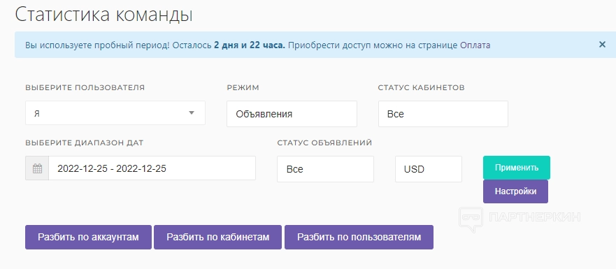 Управление командой станет доступно после покупки тарифного плана. Здесь пользователь может посмотреть статистику по каждому участнику, статус кабинетов, объявлений и другую информацию.
