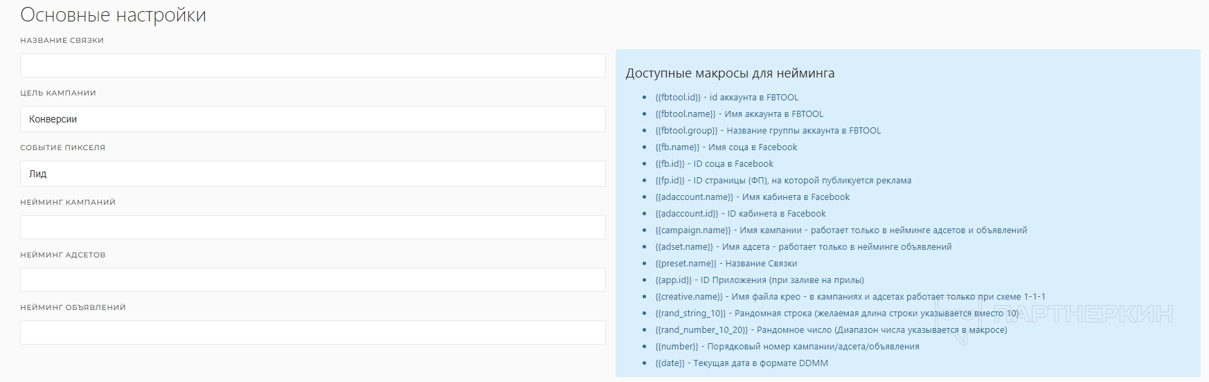 Связки. При создании связки пользователю необходимо заполнить поля с основными настройками: указать название, цель рекламной кампании (клики по ссылке, конверсии, инсталлы, лайки страницы).