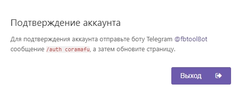 Чтобы подтвердить аккаунт, нужно зайти в Telegram и отправить боту @fboolBot сообщение «/auth_coramfu», а затем обновить страницу на главной странице.