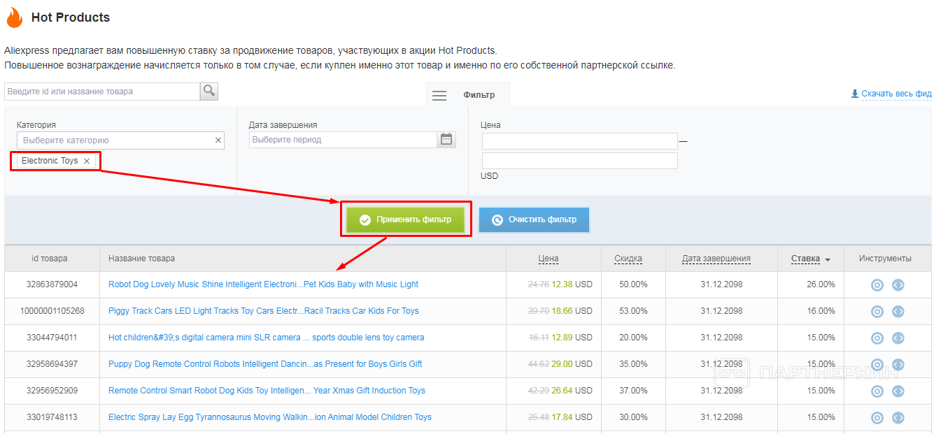 С разрешением всё ОК, теперь следующий шаг — выбор категории товаров, которую мы хотим рекламировать. В разделе «Hot Products» ищем нужную категорию и фильтруем ее по нужному нам продукту. Например, по электронным игрушкам (Electronic toys).