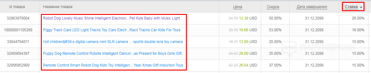 Отсортируем товары по максимальной ставке и выберем для примера первые пять.