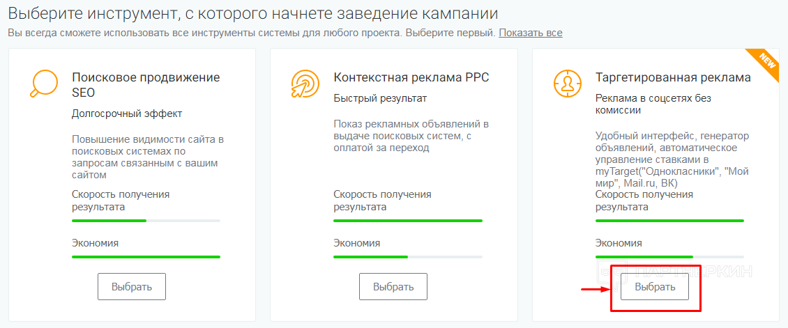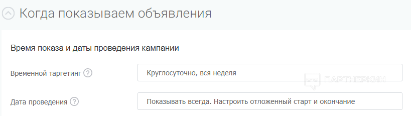 Временной график не задаем, оставляем круглосуточный показ: люди могут покупать наш товар в любое время суток. Отложенный старт тоже не задаем: скидки на наши товары по партнерской программе уже действительны, и нам ничего не нужно дополнительно готовить к запуску кампании.