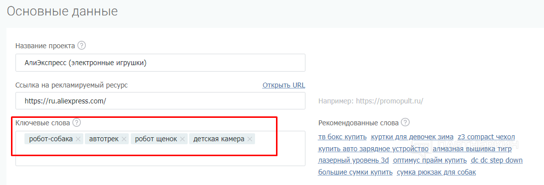 В поле «Ключевые слова» впишем названия товаров, которые планируем рекламировать. На основании этих слов система на следующих этапах сама составит рекламные объявления: подберет подходящие изображения и предложит готовые тексты. Не надо писать слишком длинные ключевые слова: два-три слова — оптимально.