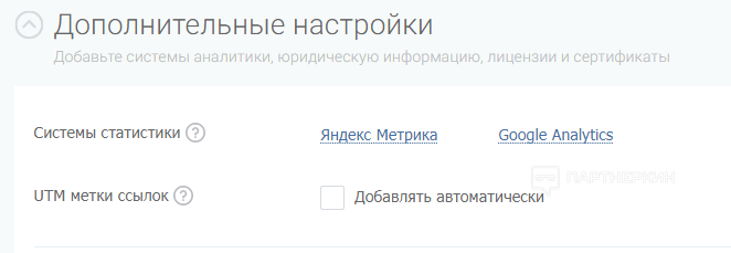Заглядываем в дополнительные настройки и убираем отметку напротив пункта «UTM метки ссылок». Так как мы используем ссылки на партнерские ресурсы и чужие посадочные страницы, собственные метки нам не нужны. Системы статистики в нашем случае подключить нельзя, но статистику можно посмотреть в