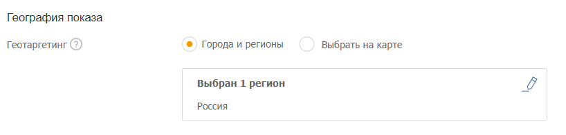 С географией показов всё просто: товары с Aliexpress можно заказать из любого уголка России, поэтому ставим такой широкий таргетинг — на всю Россию. Но если нужно, охват можно сузить до какого-то определенного региона, города или отметить нужные нам районы на карте с радиусом охвата от 500 м до 10 км.