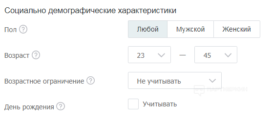 В социально-демографических характеристиках определяем пол и возраст наших потенциальных покупателей, а также, если нужно, устанавливаем возрастные ограничения. В нашем случае покупателями электронных игрушек в основном будут женщины и мужчины от 23 до 45 лет. Это и указываем в настройках.