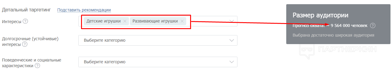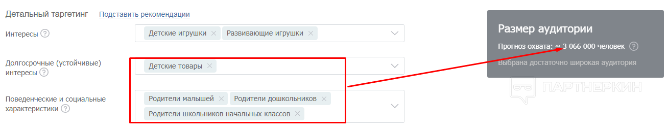 При таком таргетинге охват получается очень широкий. Можно сузить его и точнее попасть в нужную аудиторию, поработав с долгосрочными интересами и поведенческими характеристиками. Но здесь надо быть осторожнее: охват может оказаться слишком маленьким.