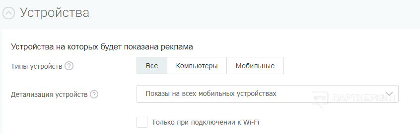 По устройствам — таргетируемся на все. Электронные игрушки могут купить и с ПК, и с мобильного. Но если хотите — можете настроить показ объявлений только на какую-то одну категорию, например, только на мобильные (причем, с учетом модели телефона), или только на устройства, подключенные к Wi-Fi.
