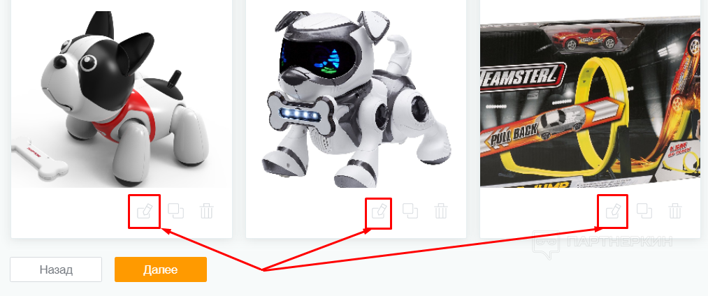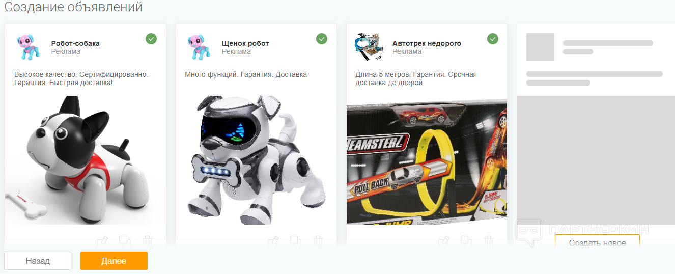 Так как тексты составляет робот, они не всегда получаются корректно. Но готовые шаблоны гораздо проще отредактировать, чем писать самим объявления с нуля. Особенно если у вас много кампаний. Кликаем на пиктограмму карандашика под картинкой, чтобы отредактировать тексты и расставить корректные партнерские URL.