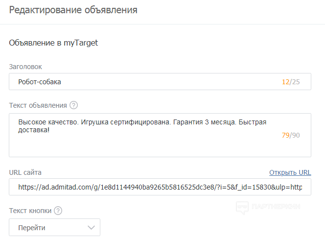 Что можно отредактировать в объявлении: заголовок и сам текст. В поле «URL сайта» вставляем нужную нам партнерскую ссылку на рекламируемый товар. Если надо — меняем текст на кнопке.