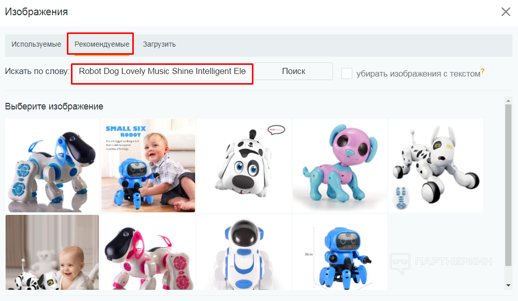 В открывшемся окне сразу идем в подраздел «Рекомендуемые». Для того чтобы система выдала вам подходящие картинки, введите в поле «искать по слову» название товара.