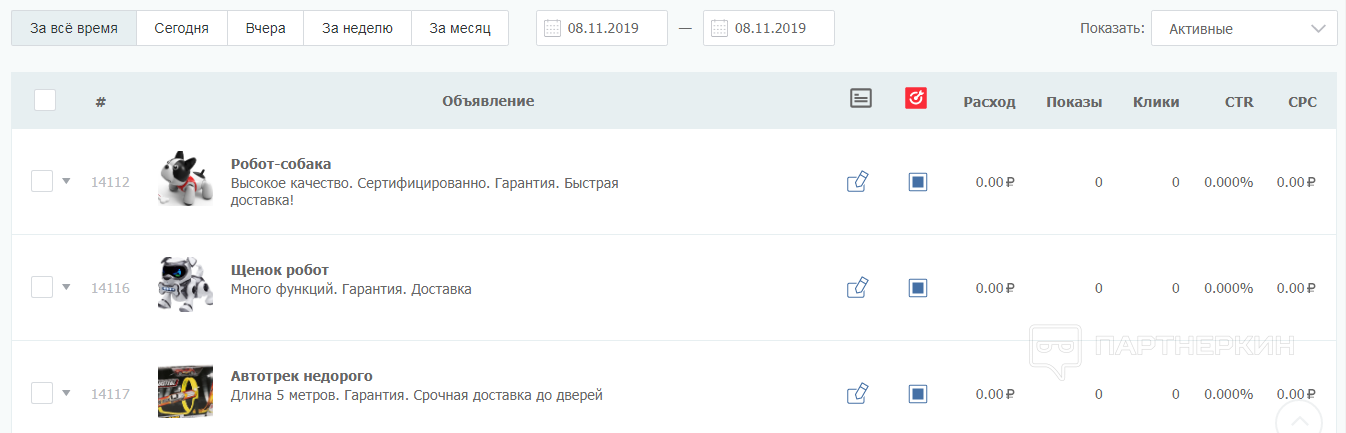 Запустили и забыли — это тут не работает. Хотя бы раз в день заглядывайте в личный кабинет и проверяйте, как идут кампании, смотрите на статистику. Здесь вы можете увидеть CTR, расход средств, охват, количество показов и т.д. Данные можно просмотреть как за весь период, так и отфильтровать по по определенному временному промежутку.