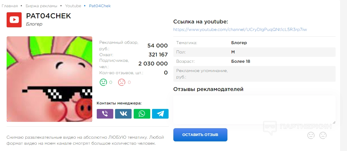 Выбираем нужную интеграцию, кликаем «Купить рекламу» и попадаем на карточку профиля, где будут контакты для связи с его владельцем.