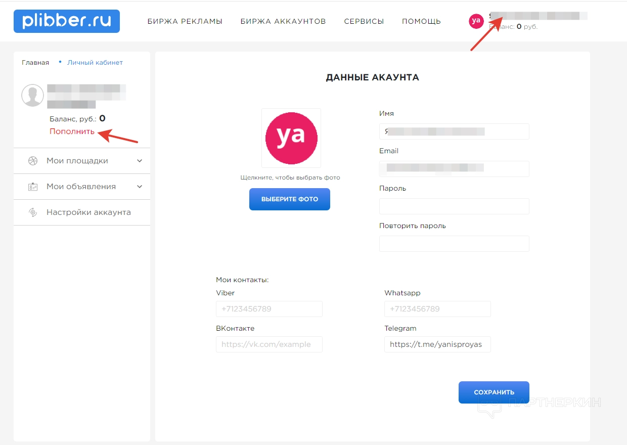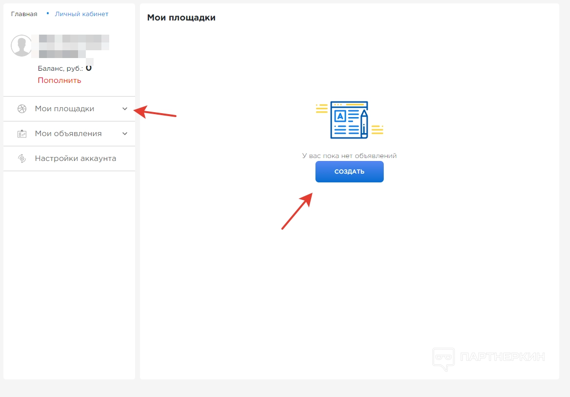 Чтобы добавить площадку, переходим в личным кабинет, ищем вкладку «Мои площадки» и кликаем на «Создать».