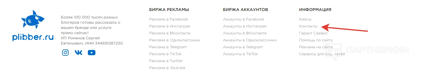 На сайте нет специального чата для обращения к сотрудникам службы поддержки, поэтому придется с ними связывать через социальные сети. Для этого спускаемся в нижнюю часть экрана и ищем вкладку «Контакты».