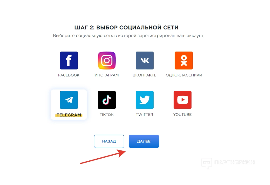 На следующем этапе пользователь должен выбрать социальную сеть и нажать «Далее».