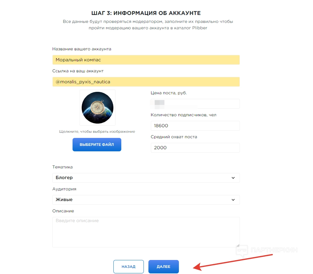 Теперь нужно указать всю необходимую информацию о площадке. В случае с ТГ-каналами это: