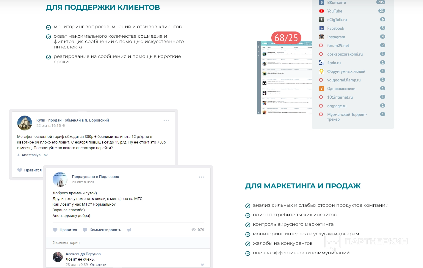 Инструмент помогает управлять коммуникациями в социальных сетях. Система собирает упоминания бренда из всех доступных источников. В мониторинг включены: