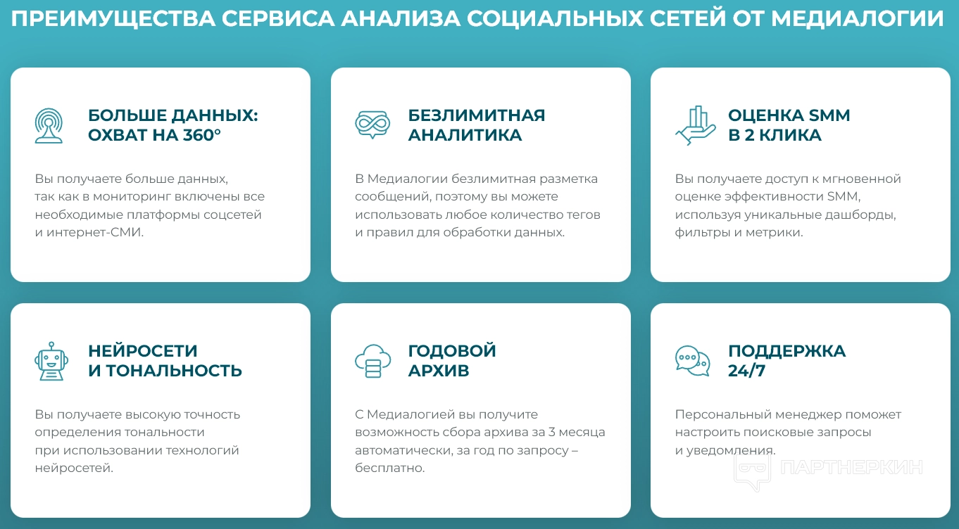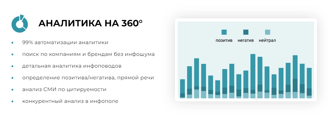 • Автоматизация процесса анализа данных . С помощью платформы можно отслеживать упоминания компании, продуктов и услуг в интернет-СМИ и социальных сетях в реальном времени. Площадка также предоставляет возможность анализировать тональность упоминаний, определять ключевые слова и темы обсуждения. Благодаря автоматизации процесса, можно сократить время, затрачиваемое на мониторинг и анализ, и быстро реагировать на изменения.