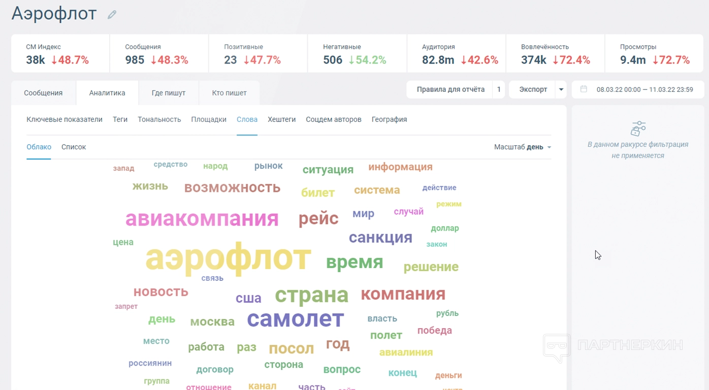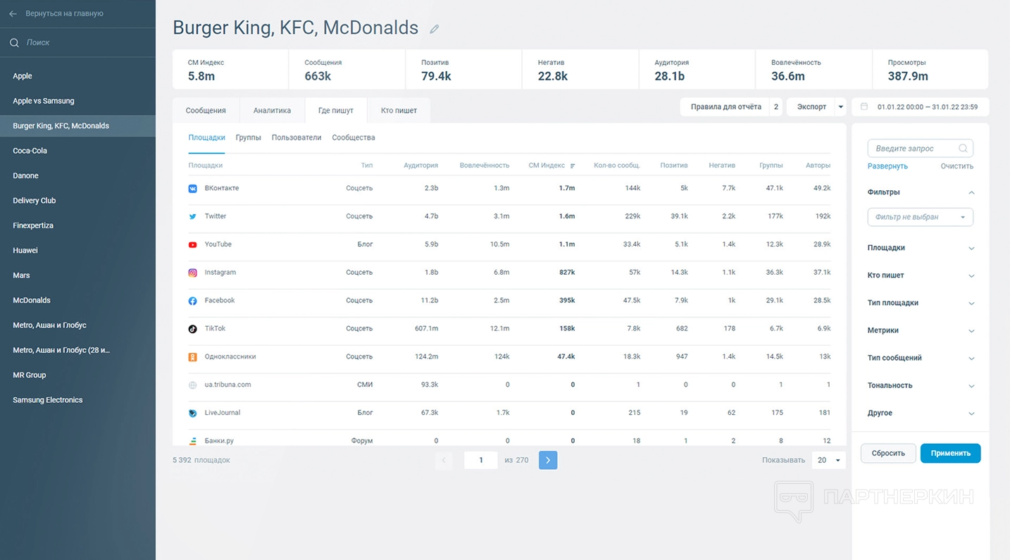 SM индекс, выражающий качество упоминаний в социальных сетях, помогает оценить эффективность SMM и выявить наиболее вирусный контент. Оперативный экспорт данных в форматах Excel или Word ускоряет процесс создания отчетов. Рейтинги ключевых инфоповодов, заслуживающих внимание блогеров, предоставляют представление о текущих трендах в социальных сетях.